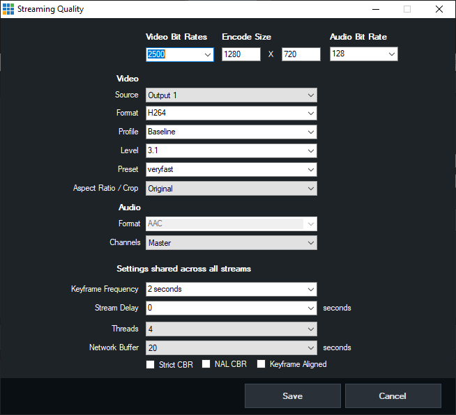 The Streaming Quality window allows you to customise your streaming quality settings to suit your production.